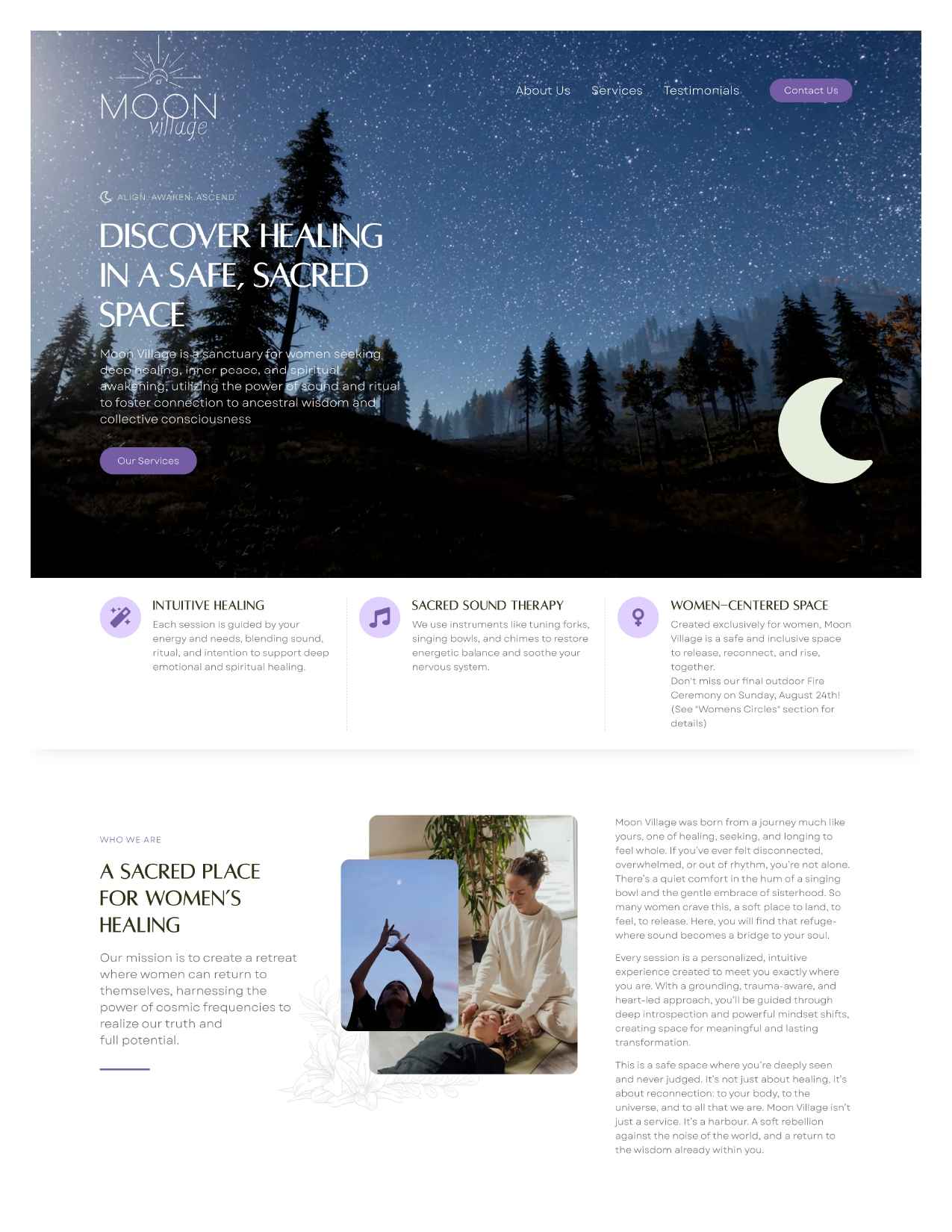 The final result is a calming intuitive and spiritually aligned website experience that reflects the purpose of Moon Village as a place of connection healing and awakening for women who are seeking transformation and inner harmony.
